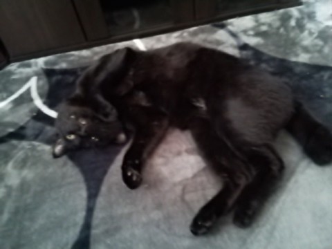 黒猫で、口元とお腹に白いアクセントあり。