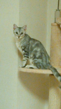 グレー・黒・白のトラ柄(アメショ柄)しっぽ長め、目イエロー、細身の体