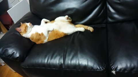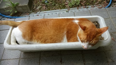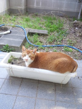 背中からしっぽまで茶とら、手足の先、お腹は白いです。鼻の右よこに茶色のぶち模様があります。首輪はしていません。去勢済みの為、太めです。