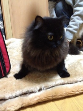 毛長の黒猫、短足、ブルーの首輪、3キロくらい