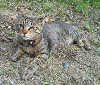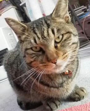 茶キジ柄 去勢済み 声は高め 左前足怪我の為、テーピング(外れてるかも) 水色のエリザベスカラー装着(いなくなる直前あり)