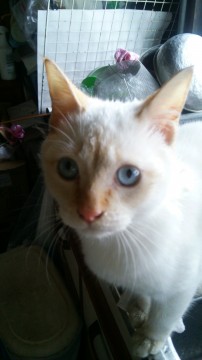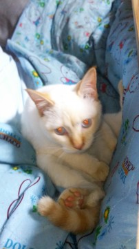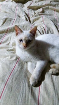 全体は白地で顔、耳先、しっぽに薄茶の虎柄