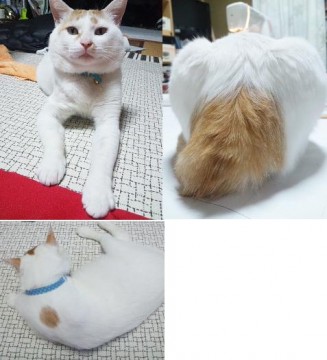頭(まばら)・しっぽ(全体)・背中(肩のあたりに直径3センチほどの円形)に茶トラ模様が入っています。
