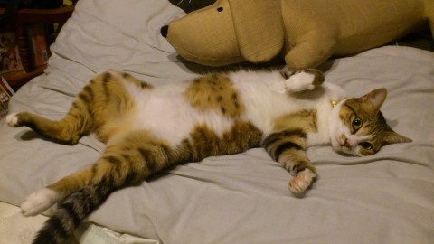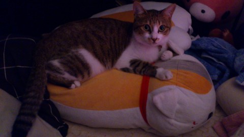 色柄:茶系のキジトラ、胸からお腹は白い、左側からみると、お尻のあたりに四角っぽい白い模様、目の下から口元は白いが、鼻周りは茶色っぽい
