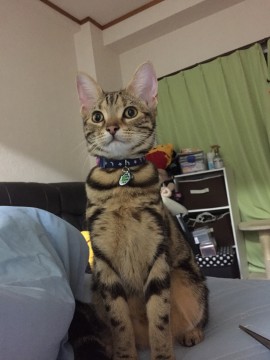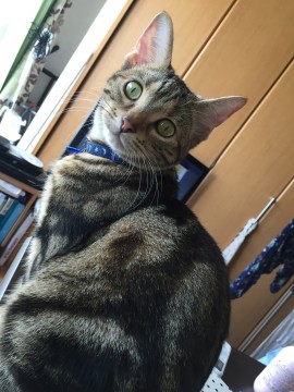 青色の鈴付きの首輪にFAMと書かれたクローバーのチャームを付けています。