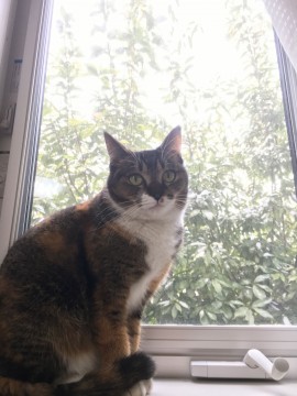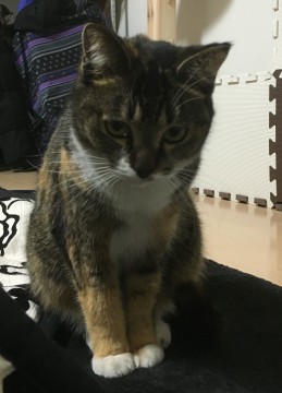 三毛で胸元と両足が白く、しっぽの真ん中付近は、けが治療のため細くなっています。避妊手術後で左耳は三角にカットしています。