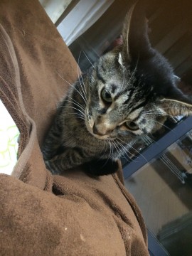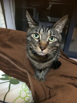 首輪なし。キジトラで白い毛はなし。しっぽ長め。男性を怖がり、女性に懐きます。黒目大きいです。