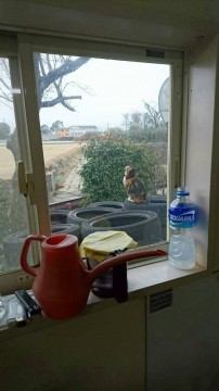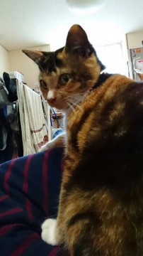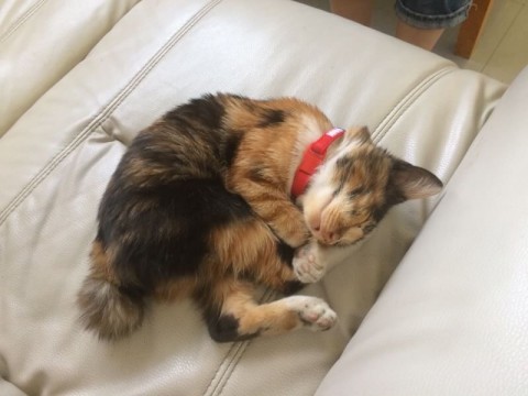 尻尾が短い。鈴の付いた赤い首輪してる。