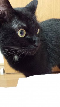 黒猫で首もとに1ヶ所白い毛があります。去勢ずみです。