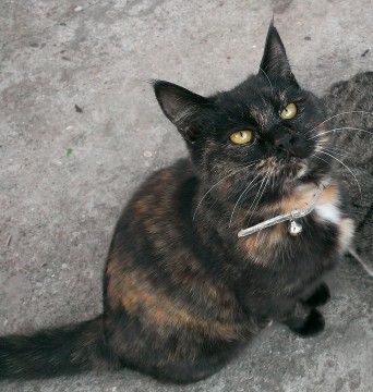 声が高い、シルバーの首輪、サビ柄、胸とお腹の一部が白い