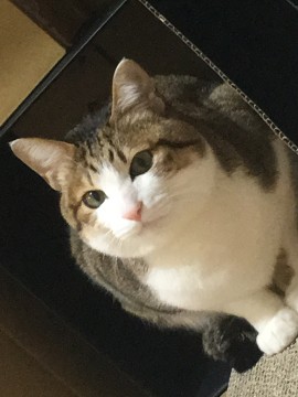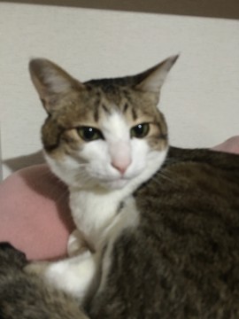 焦げ茶のトラ、鉢割れ、腹が白、昨年末に手術したため腹の毛が薄くなっています。大きめの手術跡あり。