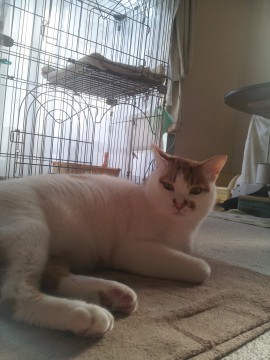 茶白のシッポの短い猫です。おおきい体つきで8キロくらいある子です。