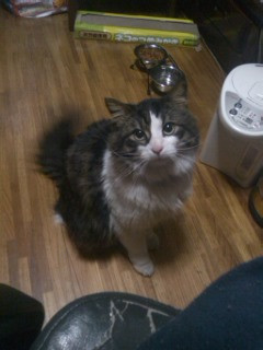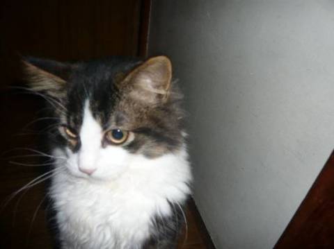2歳ぐらいの白黒猫で、長毛、尻尾の先端に触らないと分からないハゲがある。黒の首輪をしているが毛が長くてわからない。
