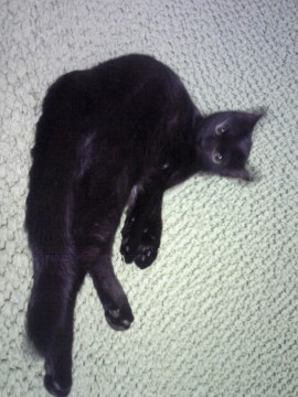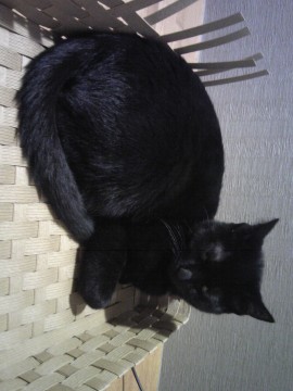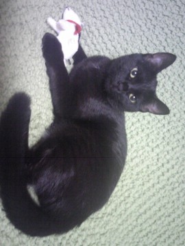 1歳メス黒猫短毛、ひげまで黒い、股に少し白毛あり。