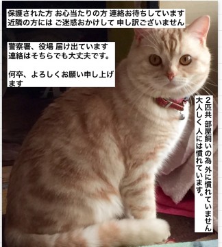 夜中 閉め忘れの玄関から出てしまいました 近所中歩きましたが見つかりませんでした 完全室内飼いの為 心配です