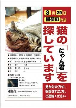 警察署や保健所等の機関には問合せ住みです。ペット探偵さんにも依頼しました。千葉市中央区とありますが脱走したのは稲荷町一丁目です。チラシのポスティングも出来る限り進めています。