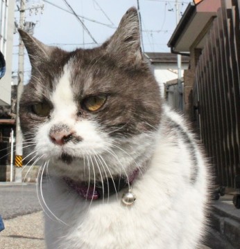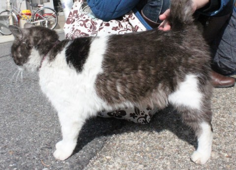 白・こげ茶のハチワレです。後脚がうまれつき不自由です。半のら庭猫で町の人々からかわいがられていました。