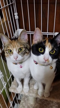 もも(左)、しま三毛、生まれてすぐに尻尾が折れて先がぷらぷらしています。ピンク系和柄の首輪