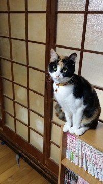 ゆず(右)、黒多めの三毛。目の周りが黒い。尻尾は長くまっすぐ。黄色系和柄の首輪