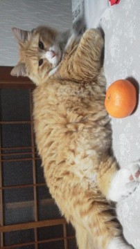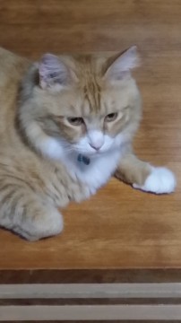 赤茶色(金色に近い)の長毛。体重8kgの大きめの猫です。青い首輪をしており、首輪には名前が書いてあります。