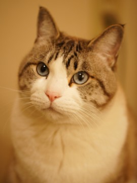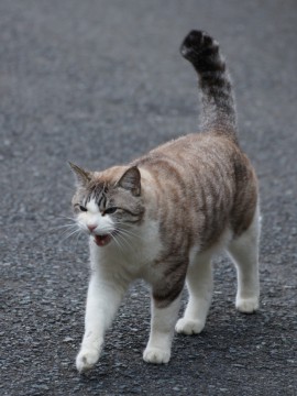 背中側はうすいシマ柄、おなか側は白、顔は八割れ。
