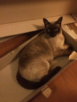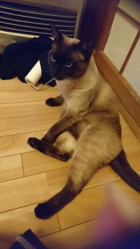 シャム風の雑種です。まだ赤ちゃんが抜けなくて自分の肉球を吸います。しっぽの先がクリンと丸まっています
