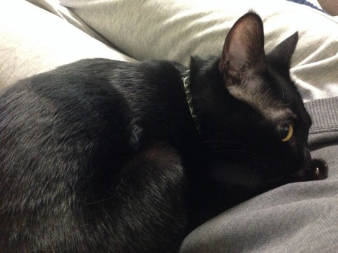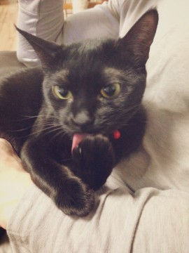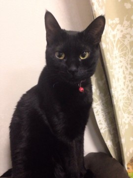 黒猫です。口元も肉球も黒です。赤と青のギンガムチェックに赤い鈴付き首輪をしています。人馴れしていますが、警戒心は強いタイプです。