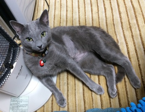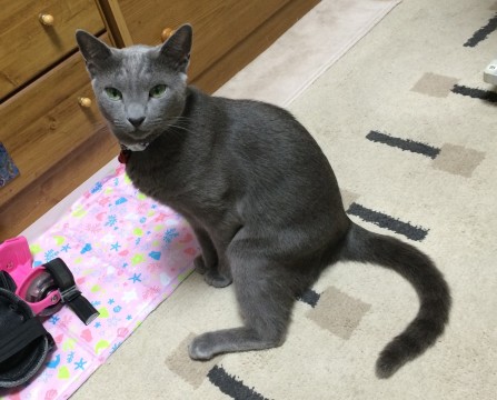 (3)首輪:グリーン系の首輪+赤の鈴、連絡先タグあり。