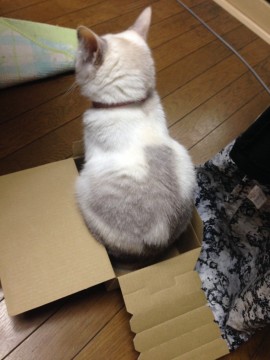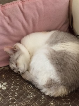 太り気味。白に背中は茶色っぽいグレーの三毛があります。