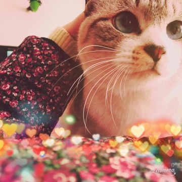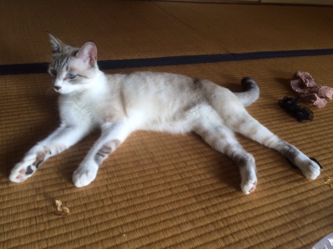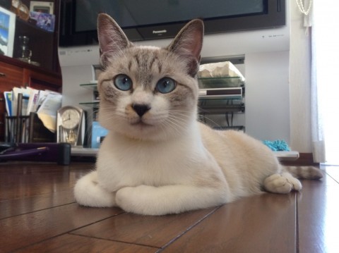 青い目、鼻先片側の薄茶が特徴。話し好きでよくニャァニャア言います。