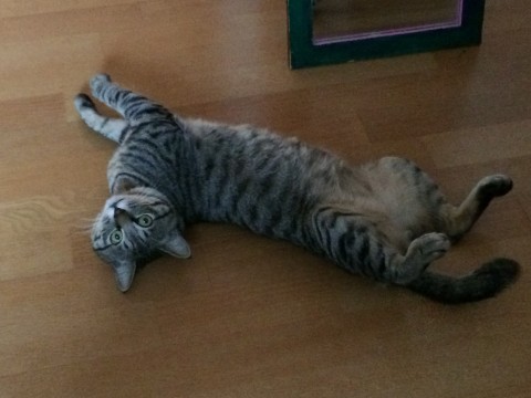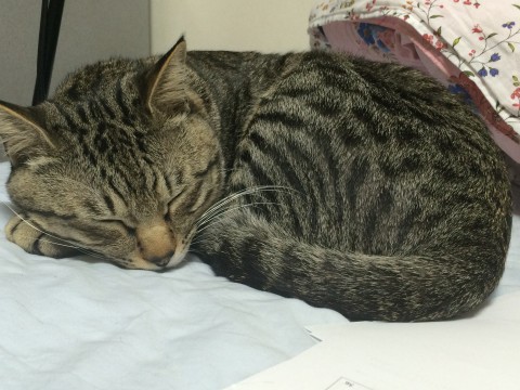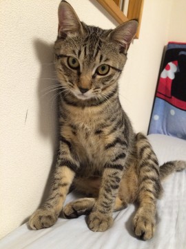 キジ猫、オス(去勢済み)、紺のチェック柄の首輪、体重5キロ程度、好奇心旺盛だけれど怖がりな性格、耳の先端の毛がちょっとだけ長い、尻尾の先が曲がっている、噛みグセあり