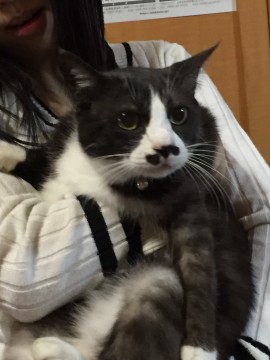 顔にとても特徴があり、取れてなければ赤い首輪をしています