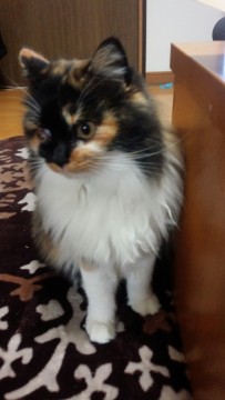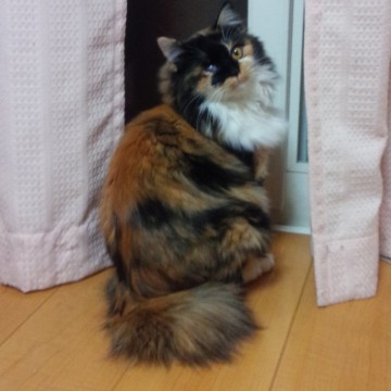 はずれていなければ小さな鈴がついた茶色っぽい首輪(毛が長いので見た目わかりにくい)