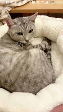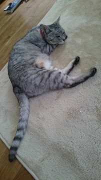 薄い灰色でトラモヨウ(グレートラ)があります。特に足と尻尾にあります。尻尾は細くて長いです。首輪はしていません。