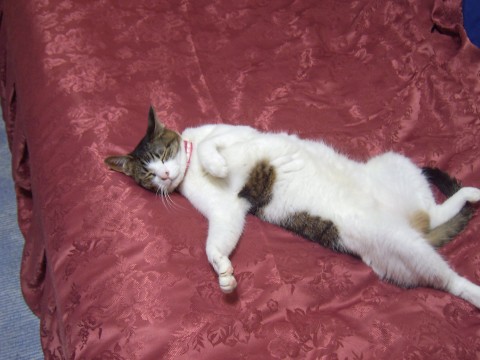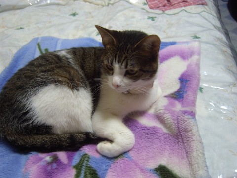 手足とお腹は真っ白で背中はグレーと少しの茶色、白い筋が一本入っています。