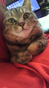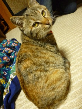キジトラ 白地にピンク、黄色の小花柄の首輪。(強く引くと外れるタイプのものなのでしていないかもしれません。)