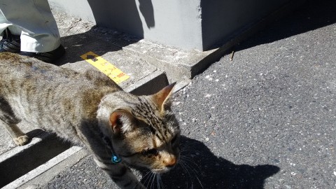 キジトラ(茶色に黒のしま)口元は白っぽい。尻尾の先は黒