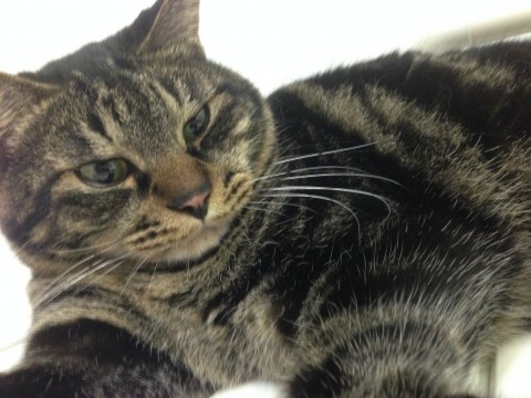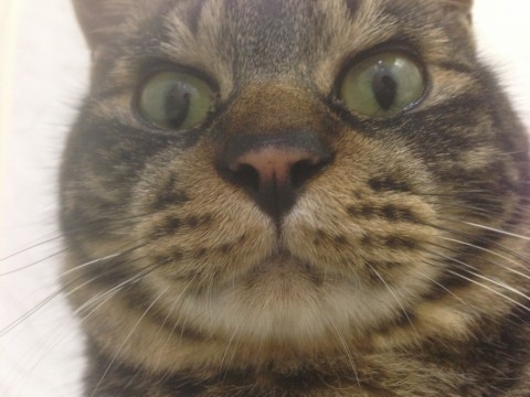 右耳に小さなハゲがあり、鼻の穴の下と顎の部分だけ白く模様が入っています。