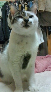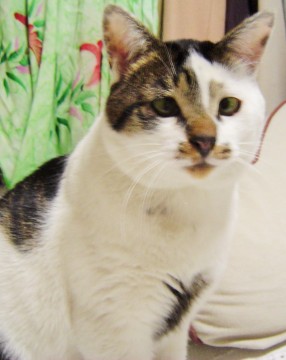 白地に黒のブチ猫だけど、黒い所も真っ黒じゃなくて茶キジが混じっている毛色です。