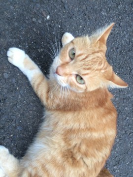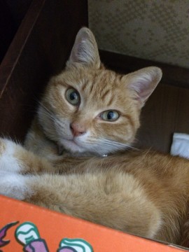 小柄な茶トラです。ピンク色のリボンをしています。