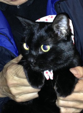 巻尾の黒猫です。お腹に白いハート型の斑があります。