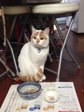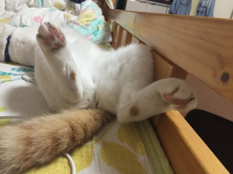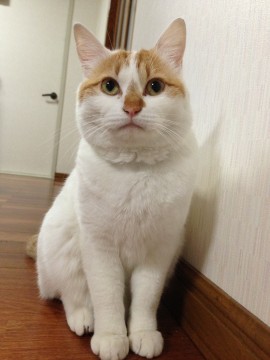 顔と尻尾だけが茶色で身体は白色をしています。尻尾は茶と白のシマシマ模様です。両足の裏に茶色の丸い点が一つずつあります。目の色は緑色です。写真では首輪をしているのですが逃げた時は着用していませんでした。