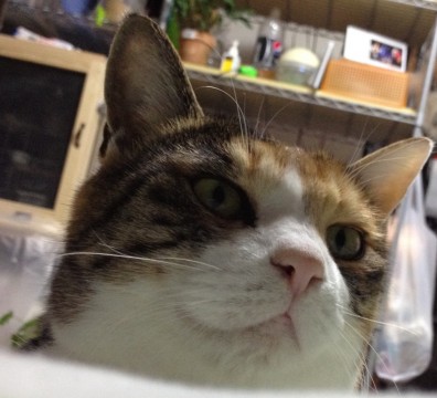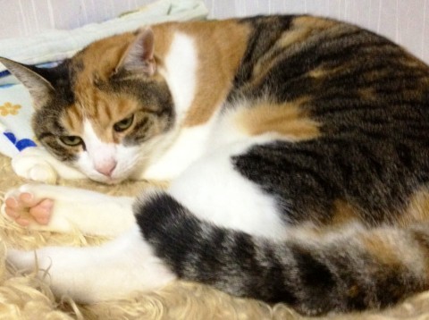 体格は大き目です(5・5キロ)。よく鳴く甘えん坊です。少し臆病なところもあります。首輪はしていません。三毛猫ですが黒の部分は薄くシマシマが入っています。尻尾の先が白いです。