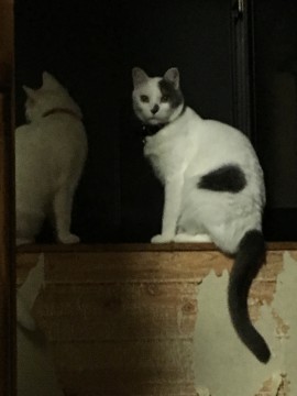 全体は白ですが鼻と左目付近、左脇腹に黒ブチ(真っ黒では無くてグレーっぽいです)有り。シッポは長く黒です。