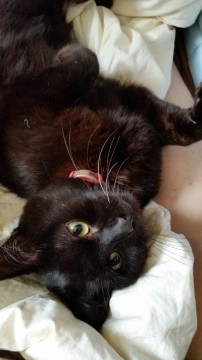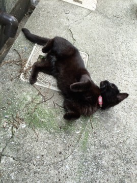 真っ黒の女の子でお腹のところに白い毛が少しあります。