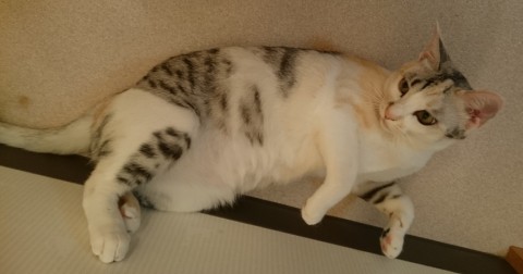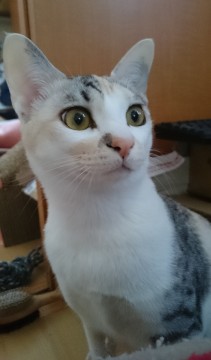 ・短毛/白ベースにサバトラ模様、部分的に薄い茶色のスポットあり