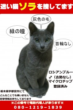 1歳と少しのロシアンブルー雄猫を捜しております。