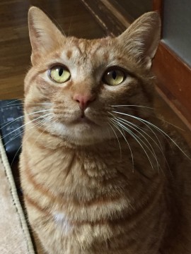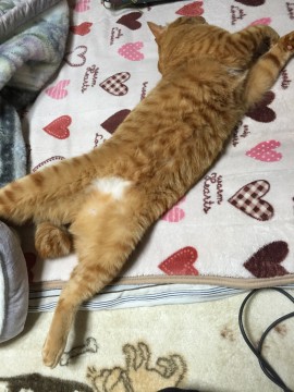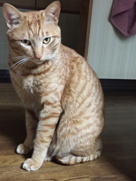 茶トラで尻尾は短めで内側に曲がったカギ尻尾。体は大きい。後ろ足の付け根のお腹が白い。