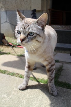 白い短毛雑種オス、成猫とかわらない大きさ2.7キロ程度、青い目。しっぽや手足に黒いしま模様。青くて金色の鈴がついた首輪をしています。