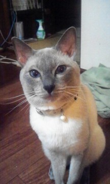 トンキニーズで去勢していません。色はプラチナミンク(グレーと白)目の色は青です。室内飼いしていたので臆病でビビりです。